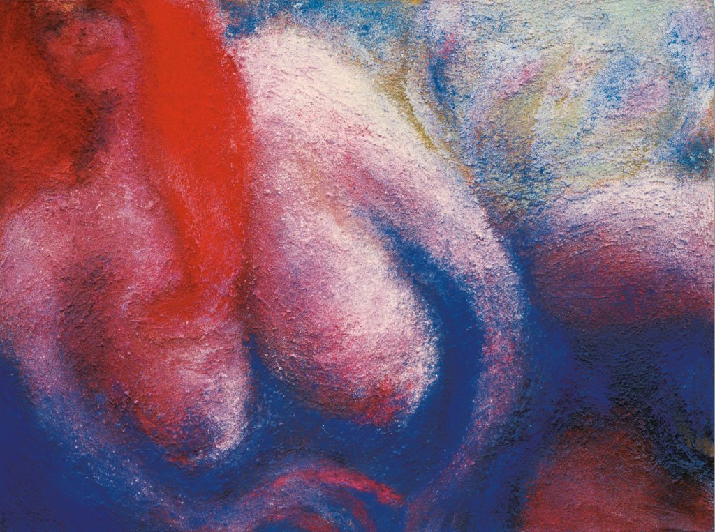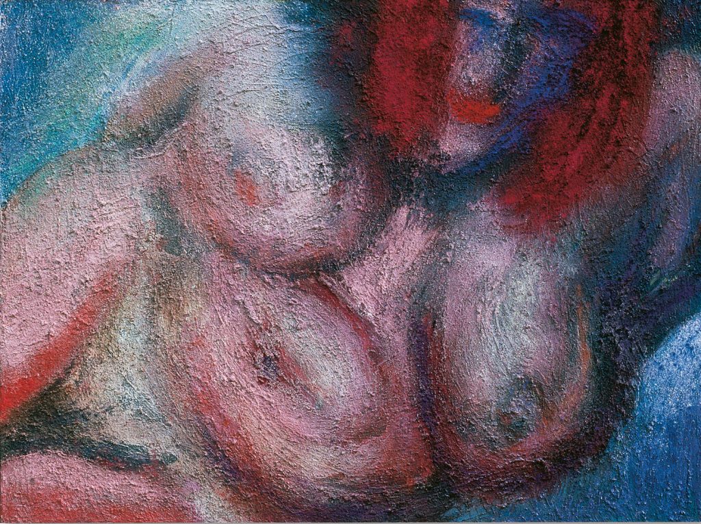 Doch haben wir uns bisher lediglich mit einem Bild des Werkes befasst: Ebenso wie beispielsweise „Frau in Blau“, „Dicke mit gelben Haaren“ oder „Rote Haare“ sind die Frauenbildnisse ein zweiteilig konzipiertes Werk, ein Diptychon. Die figurative Darstellung ist nur eine Seite eines größeren Ganzen, dessen sinnlich-emotionale Dimension sich erst vollständig erschließt in der Zusammensicht mit dem „Zwilling“, eine farbige „Impression“, wie Stieghorst selbst das nonfigurative Pendant nennt. Die meisten ihrer Arbeiten sind zwei- oder dreiteilig. Für die Malerin ist es wichtig, dass die Arbeiten miteinander kommunizieren, einen Dialog entstehen zu lassen.