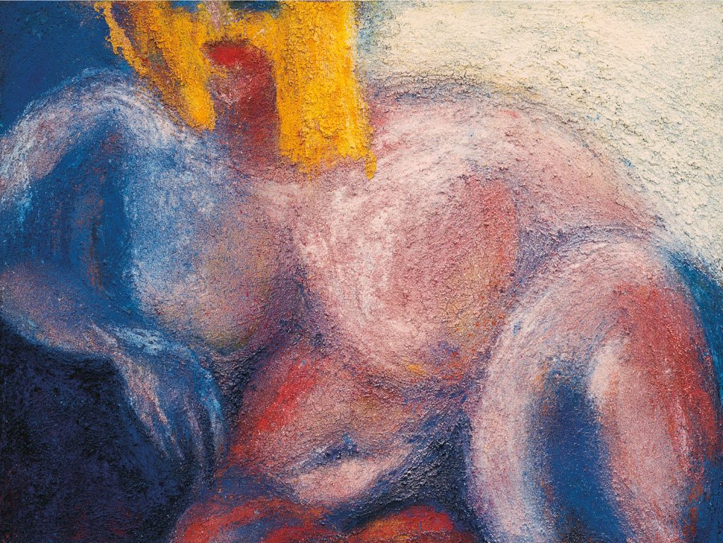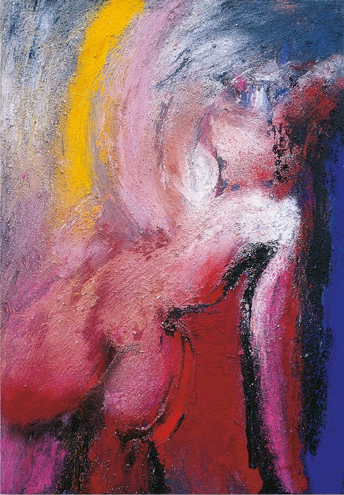 „Frau mit gelben Haaren“. Acryl, Pigment auf Leinwand, Größe 210 x 155 cm.