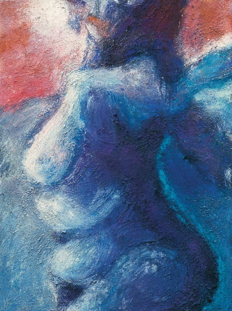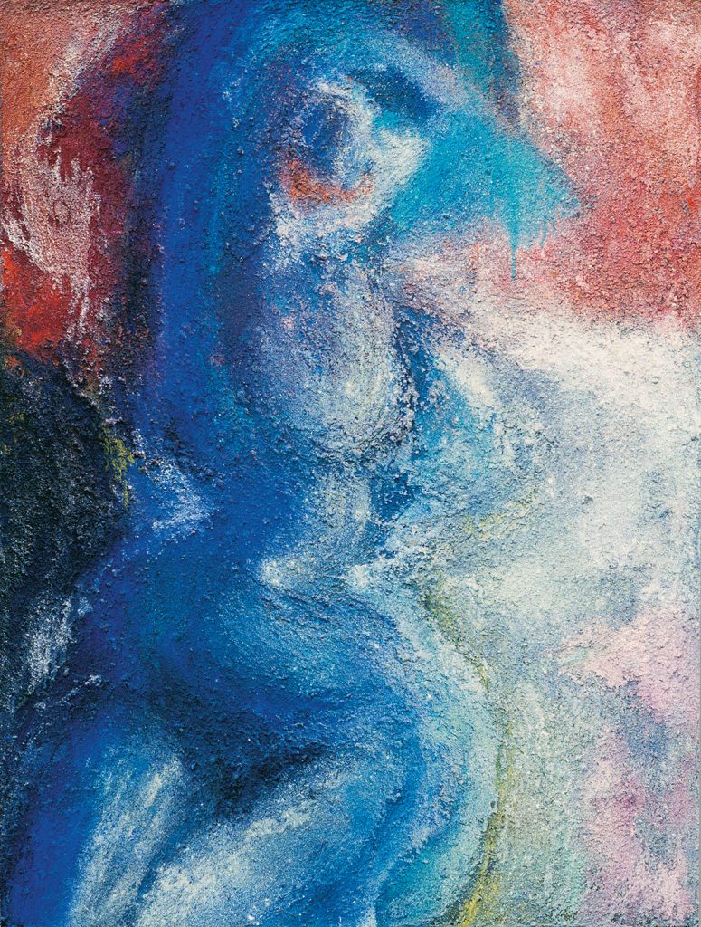„Die 1. blaue Frau“. Acryl, Pigment auf Leinwand, Größe 155 x 200 cm.