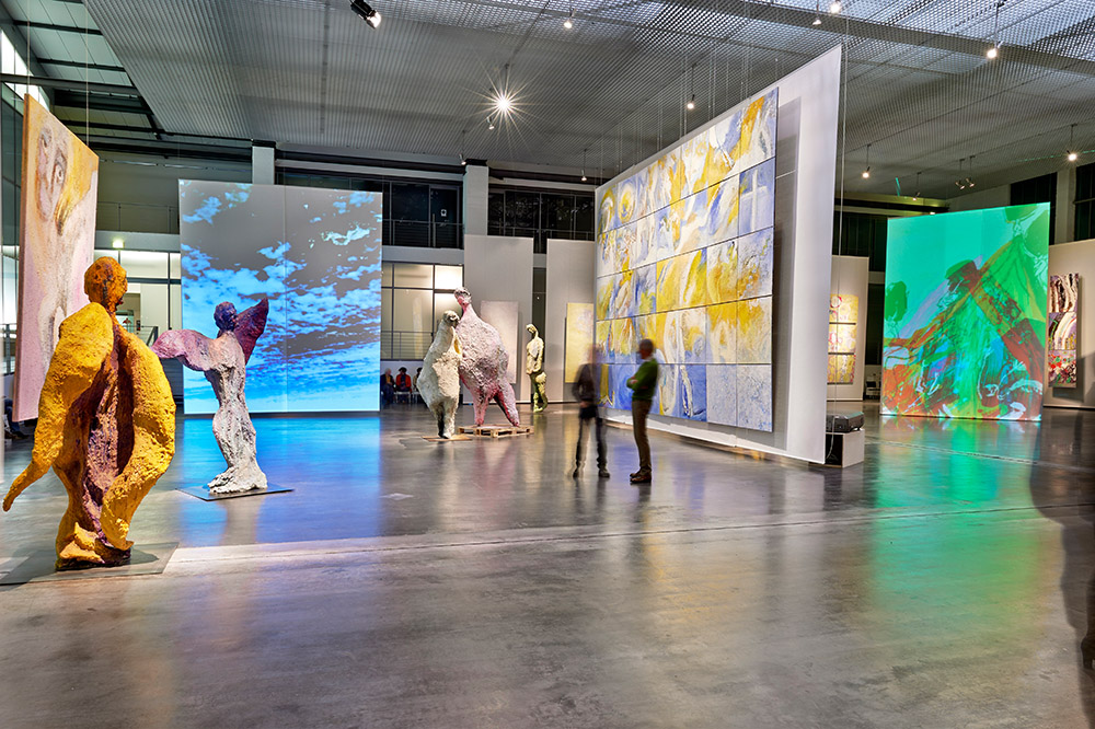 100 Gemälden je 100 cm x 100 cm. Jedem Gemälde ist ein Text-Vers aus dem dazugehörigem Gesang zugeordnet.